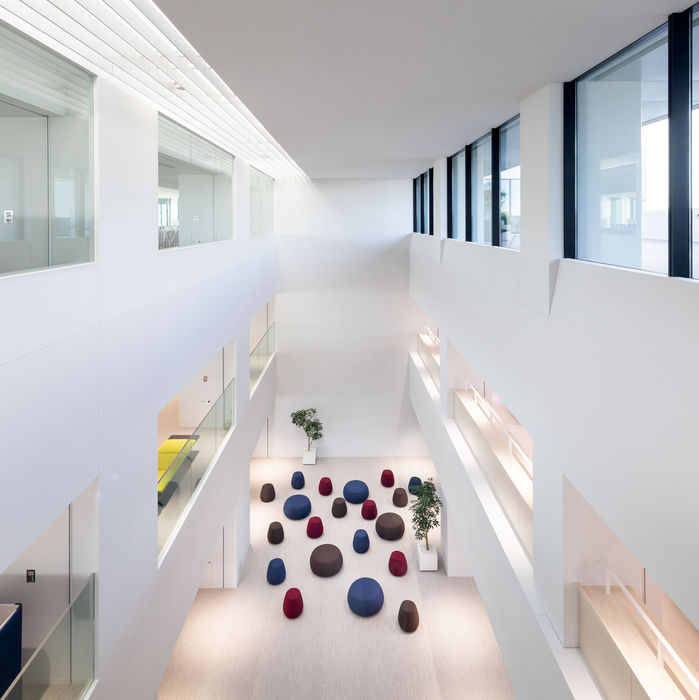 Interior design by Riccardo Daniel with Arper mirrors this harmony. Light surfaces are paired with furnishings in greens and warm autumnal tones, helping define the mood and purpose of each space. With creative director Ichiro Iwasaki bridging Sigma and Arper, the interiors balance “concentration” and “relaxation” to support the precision-driven work of Sigma’s teams.