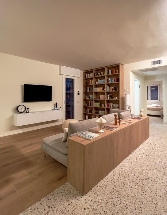 A house in the center of Treviso, conceived for three people through the orchestration of three materials. A complete restoration that began from a challenging pre-existing condition: a former dental office. The existing partition walls were systematically demolished to expand and unify the living room and entrance, transforming them into a single, flowing spatial sequence. This radical gesture liberates the plan from its previous programmatic constraints.